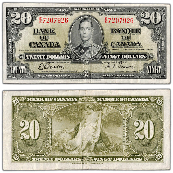 Available for sale is a $20 1937 Bank of Canada Note Gordon-Towers E/E Prefix BC-26b - VF (tear) Country: Canada - The Bank of Canada Year: 1937 Denomination: 20 Dollars...
