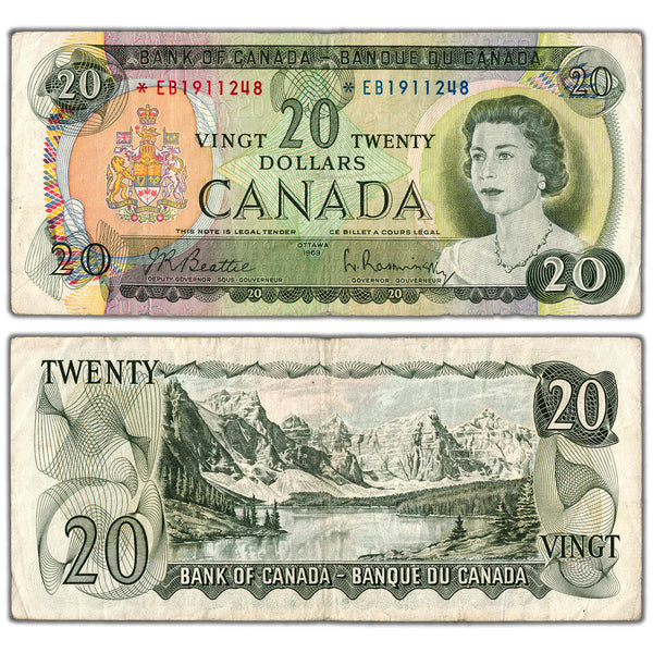 Available for sale is a $20 1969 Bank of Canada Note *EB Replacement Prefix BC-50aA - Circulated Country: Canada Year: 1969 Denomination: 20 Dollars Signatures: Beattie-Rasminsky Prefix/Series: *EB Replacement Variety:...