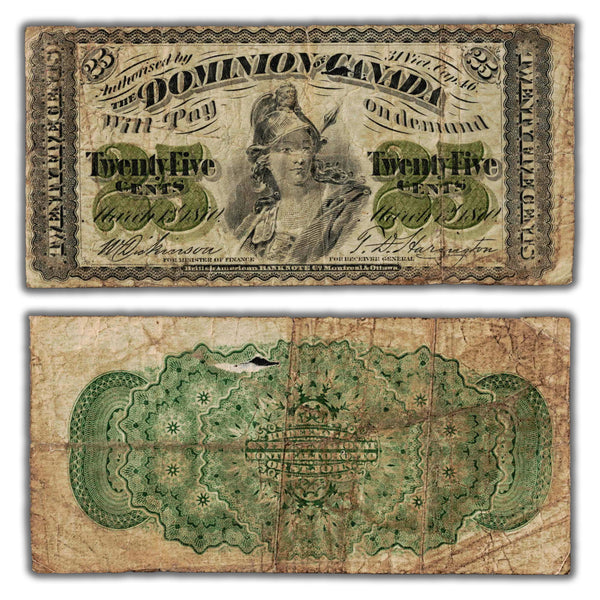 25 Cents 1870 Dominion of Canada Shinplaster Note Plain DC-1c - Fine (hole)