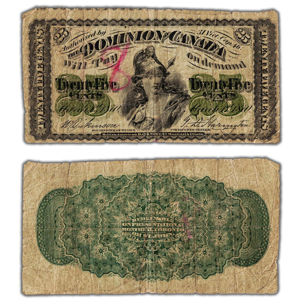 SOLD 25 Cents 1870 Dominion of Canada Shinplaster Note Plain DC-1c - Writing