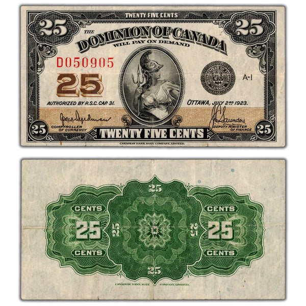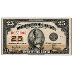 Available for sale is a 25 Cents 1923 Dominion of Canada Shinplaster Note DC-24a - VF+