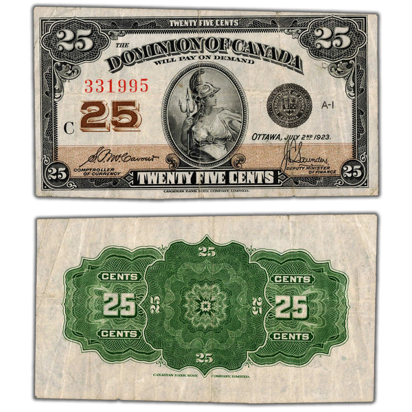 Available for sale is a 25 Cents 1923 Dominion of Canada Shinplaster Note DC-24c - VF Country: Canada - The Dominion of Canada Year: 1923 Denomination: 25 Cents Signatures: McCavour-Saunders...