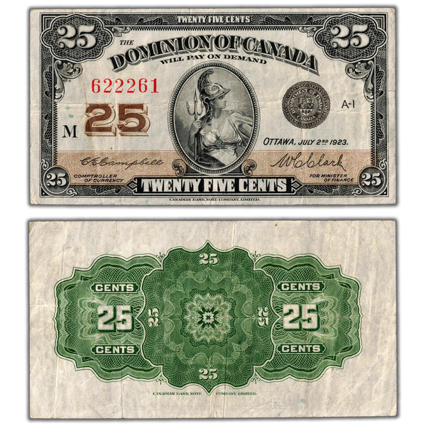 Available for sale is a 25 Cents 1923 Dominion of Canada Shinplaster Note DC-24d - VF Country: Canada Year: 1923 Denomination: 25 Cents Signatures: Campbell-Clark Prefix/Series: M Catalogue: Charlton DC-24d...