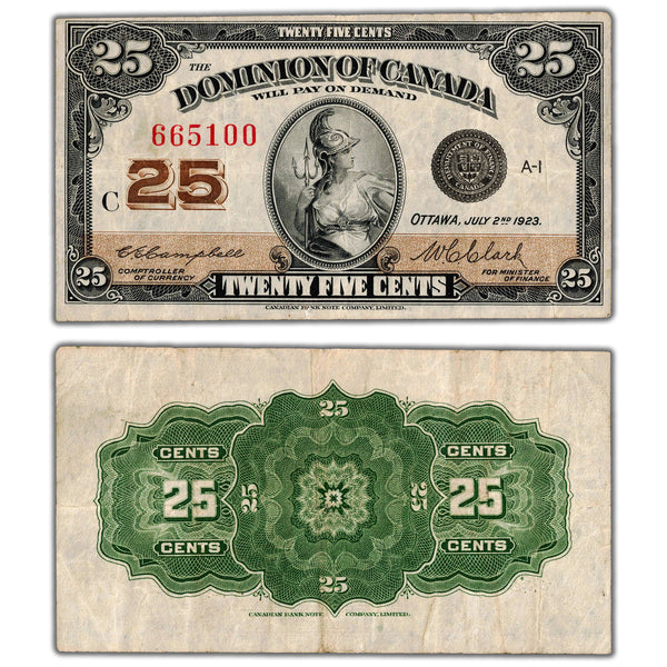 Available for sale is a 25 Cents 1923 Dominion of Canada Shinplaster Note DC-24d - VF+ Country: Canada - The Dominion of Canada Year: 1923 Denomination: 25 Cents Signatures: Campbell-Clark...