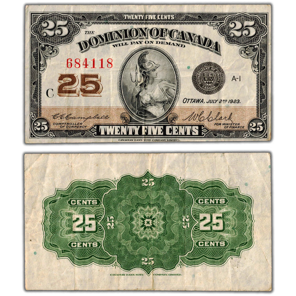 Available for sale is a 25 Cents 1923 Dominion of Canada Shinplaster Note DC-24d - VF Country: Canada Year: 1923 Denomination: 25 Cents Signatures: Campbell-Clark Prefix/Series: C Catalogue: Charlton DC-24d...