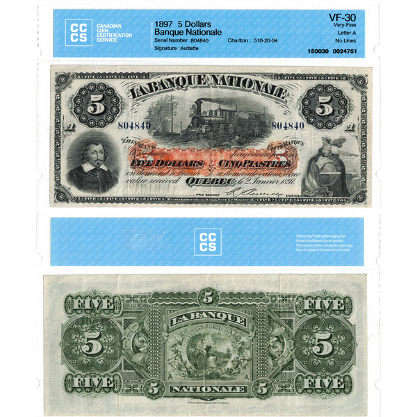SOLD $5 1897 La Banque Nationale Canada Chartered Note #510-20-04 - CCCS VF-30