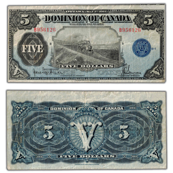 SOLD $5 1912 Dominion of Canada Note Seal Only Countersigned DC-21f - VF (minor writing)