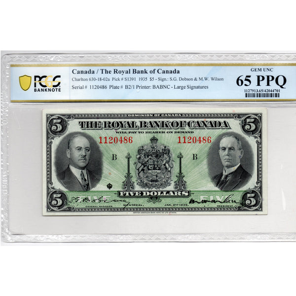 SOLD $5 1935 Royal Bank of Canada Chartered Note CH #630-18-02a - PCGS UNC-65 PPQ