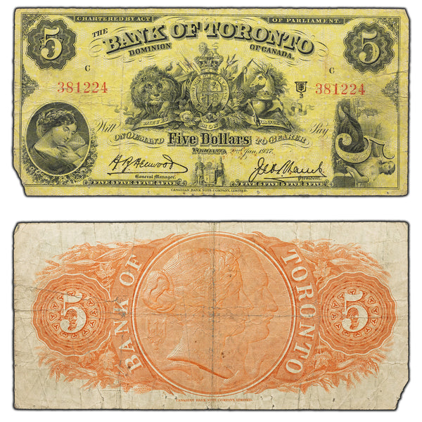 Available of for sale is a SOLD $5 1937 Bank of Toronto Canada Chartered Note #715-24-06 - Missing Corner