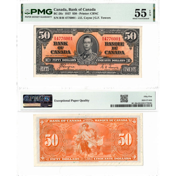 Available for sale is a $50 1937 Bank of Canada Note Coyne-Towers B/H Prefix BC-26c - PMG AU-55 EPQ