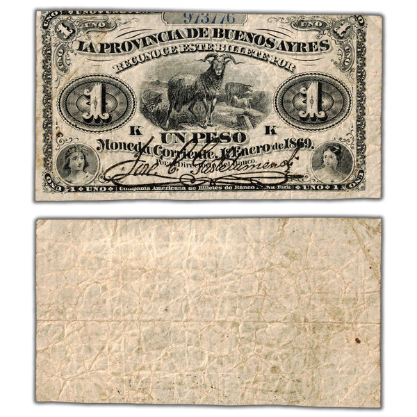 Available for sale is a Argentina La Provincia de Buenos Aires 1869 1 One Peso Note P #S481b - Circulated  Country: Argentina Year: 1869 Denomination: 1 Peso Catalogue: Pick #S481b...