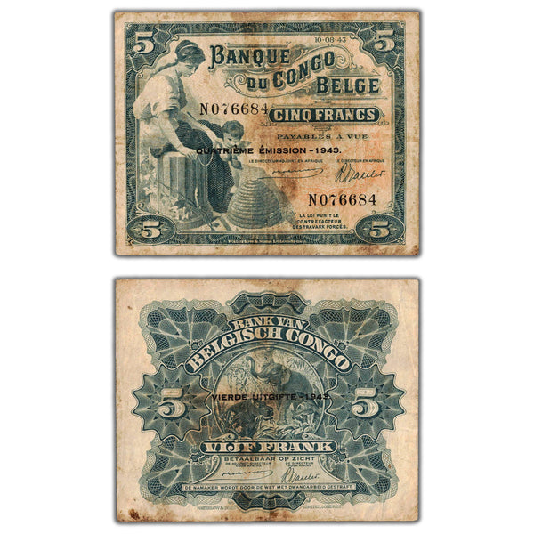 Available for sale is a Belgian Congo 1943 5 Five Francs Note P #13Ab SKU: N076684