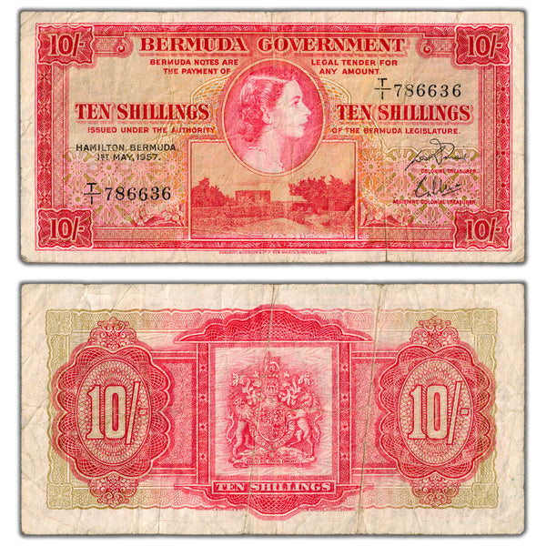 Available for sale is a Bermuda 1957 10 Ten Shillings Note P #19b - Circulated