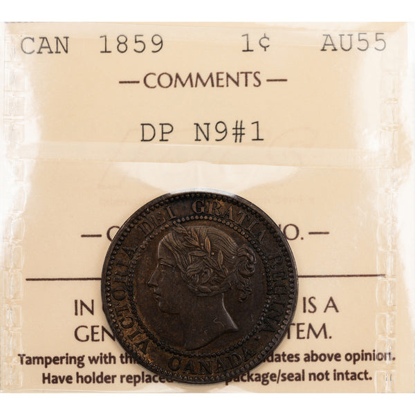 Available for sale is a Canada 1859 DP N9 #1 1 Large Cent Coin - ICCS AU-55 SKU: ICCS XSO 968