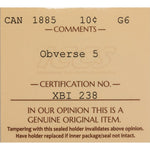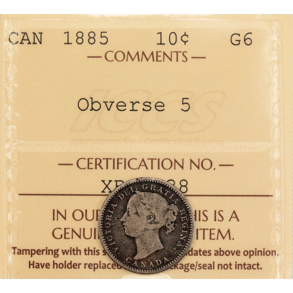 Available for sale is a Canada 1885 Obverse 5 10 Cents Dime Silver Coin - ICCS G-6 Country: Canada Year: 1885 Denomination: Ten Cents Quantity Minted: 400,000 Composition: Silver (.925)...