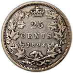 Canada 1894 25 Cents Quarter Silver Coin - F-15 (cleaned)