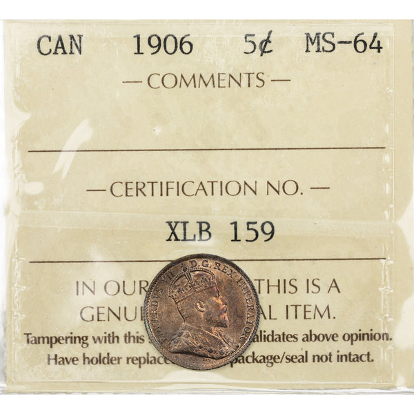 Available for sale is a Canada 1906 5 Cents Silver Coin - ICCS MS-64 SKU: XLB 159