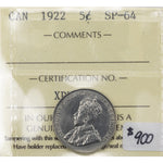 Canada 1922 5 Cents Nickel Coin - ICCS Specimen SP-64