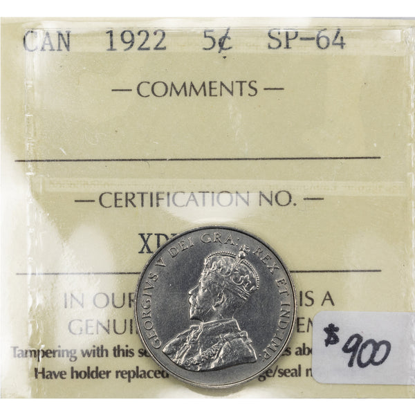 Available for sale is a Canada 1922 5 Cents Nickel Coin - ICCS Specimen SP-64