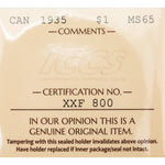 Available for sale is a Canada 1935 $1 Silver Dollar Coin First Year of Issue! - MS-65 SKU: XXF 800