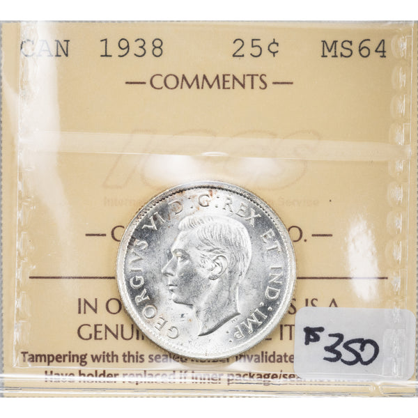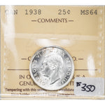Canada 1938 25 Cents Quarter Silver Coin - ICCS MS-64
