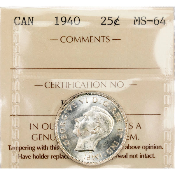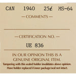 Canada 1940 25 Cents Quarter Silver Coin - ICCS MS-64