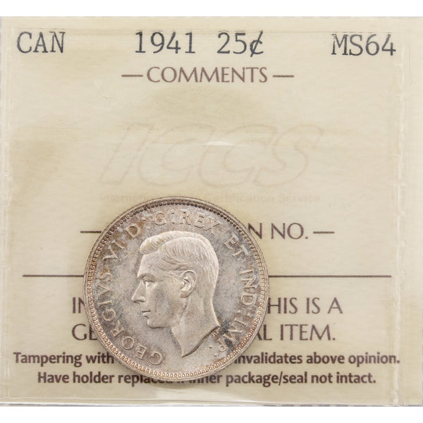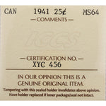 Canada 1941 25 Cents Quarter Silver Coin - ICCS MS-64