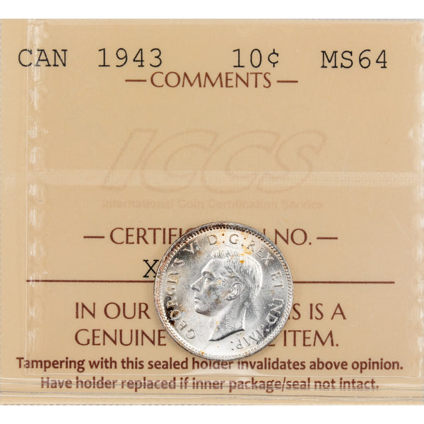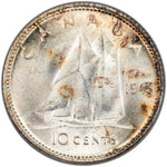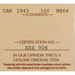 Canada 1943 10 Cents Dime Silver Coin - ICCS MS-64
