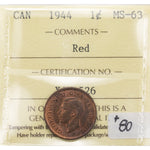 Canada 1944 1 Small Cent Coin - ICCS MS-63 Red