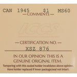 Canada 1945 $1 Silver Dollar Coin - ICCS MS-60