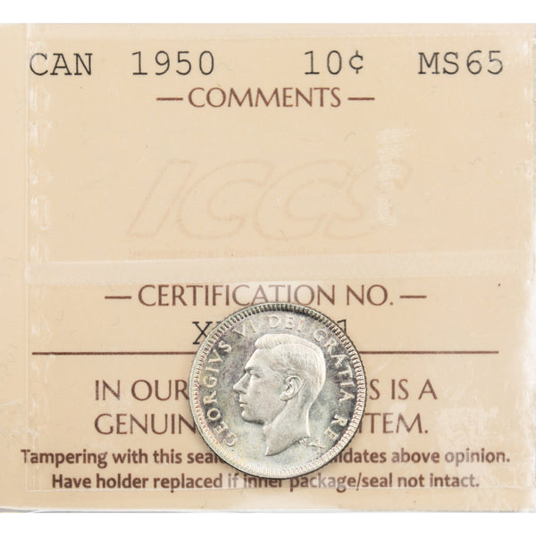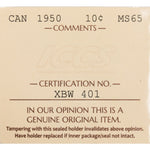 Available for sale is a Canada 1950 10 Cents Dime Silver Coin - ICCS MS-65 SKU: XBW 401