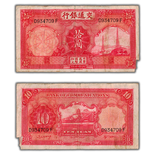 SOLD China Bank of Communications 1935 10 Yuan Note P #155 - Missing Corner