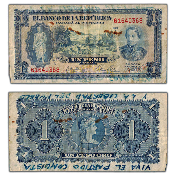 Available for sale is a Colombia 1953 1 One Peso Oro Note - Political Message SKU: 61640368
