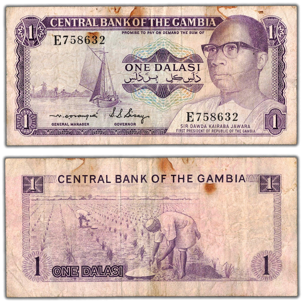 Available for sale is a Gambia ND (1971-87) 1 One Dalasi Note P #4c - Stains Country: Gambia Year: No Date (1971-87) Denomination: 1 Dalasi Prefix/Series: E Catalogue: Pick #4c...