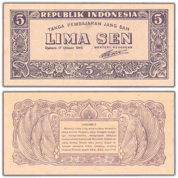 Indonesia 1945 5 Five Sen Note P #14 - UNC