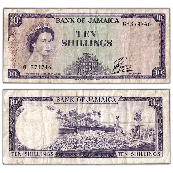 Available for sale is a Jamaica ND (1964) 10 Ten Shillings Note P #51Bb - Circulated Country: Jamaica Year: No Date (1964) Denomination: 10 Shillings Catalogue: Pick #51Bb Grade: Circulated Serial/SKU:...