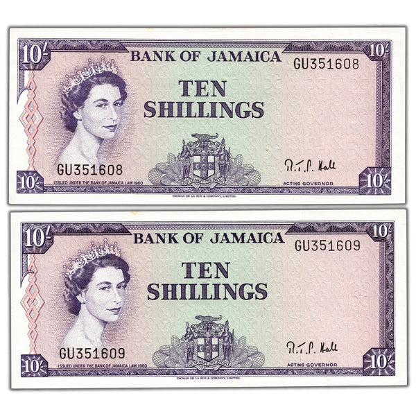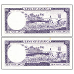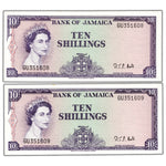 Available for sale is a Jamaica ND (1964) 10 Ten Shillings Notes P #51Bc - 2 Consecutive AU