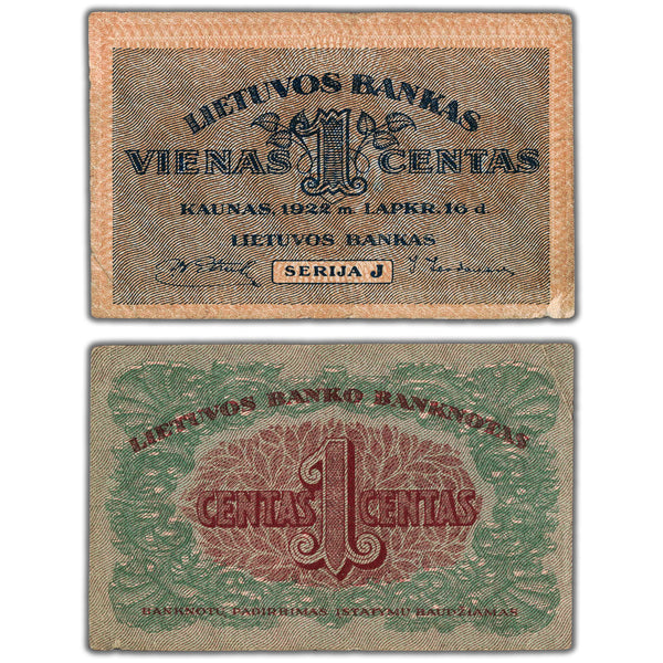 SOLD Lithuania 1922 1 One Centas Note P #7 - VF/EF Country: Lithuania Year: 1922 Denomination: 1 Centas Catalogue: Pick #7 Grade: VF/EF Serial/SKU: LITH663