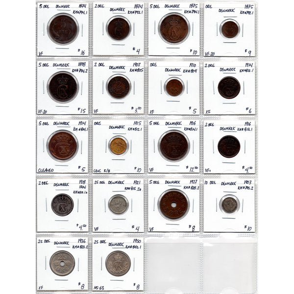 Available for sale is a Lot of 20 Denmark Coins 1874-1950 - Catalogue $143 - 35% OFF!