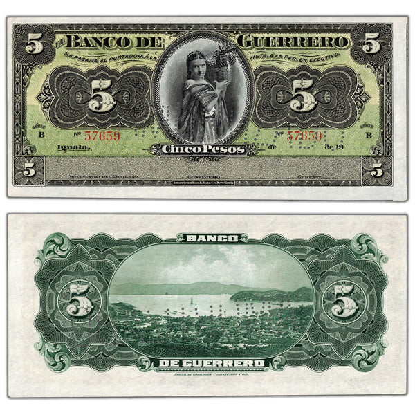Available for sale is a Mexico El Banco de Guerrero ND (Ca. 1914) 5 Five Pesos Note P #S298c - AU/UNC Country: Mexico - El Banco de Guerrero Year: Ca....