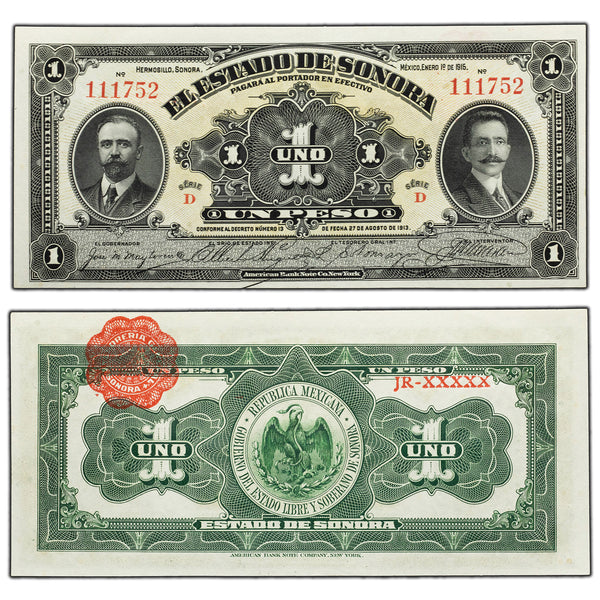 SOLD Mexico El Estado De Sonora 1913 1 One Peso Note - UNC