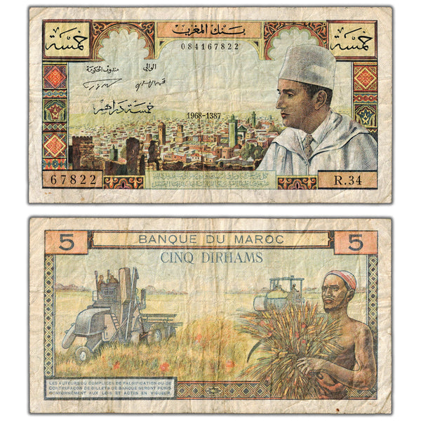 Available for sale is a Morocco 1968 5 Five Dirhams Note P #53e - Circulated Country: Morocco Year: 1968 Denomination: 5 Dirhams Catalogue: Pick #53e Grade: Circulated Serial/SKU: 084167822