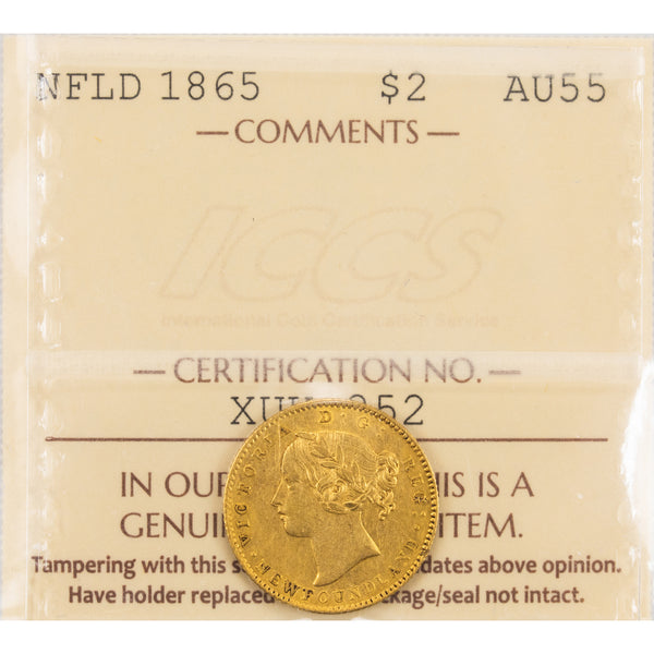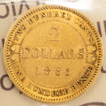 SOLD Newfoundland 1865 $2 Two Dollars Gold Coin - ICCS AU-55