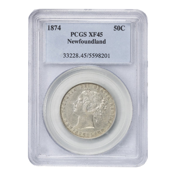 Available for sale is a Newfoundland 1874 50 Cents Silver Coin - PCGS XF-45