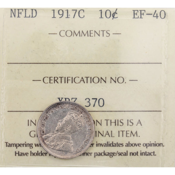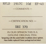 Available for sale is a Newfoundland 1917-C 10 Cents Dime Silver Coin - ICCS EF-40 SKU: XRZ 370