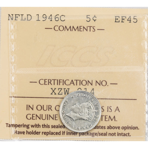 SOLD Newfoundland 1946-C 5 Cents Silver Coin - ICCS EF-45