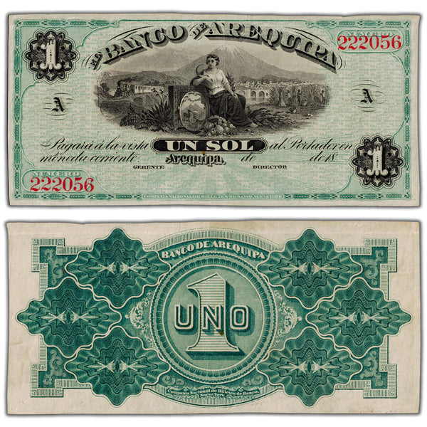 Available for sale is a Peru El Banco de Arequipa 1870's 1 Sol Remainder Note P #S117 - VF/EF
