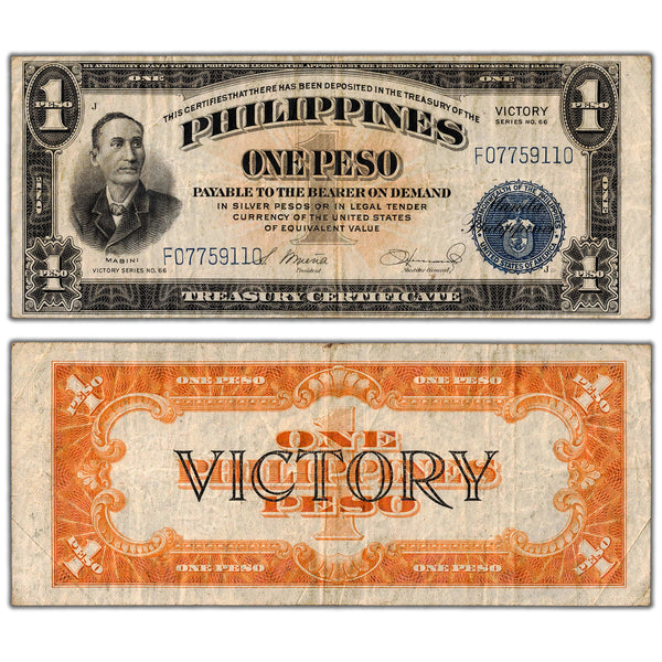 Available for sale is a Philippines ND (1944) 1 One Peso Note P #94a - Circulated Country: Philipppines Year: No Date (1944) Denomination: 1 Peso Prefix/Series: No. 66 Variety: "Victory"...