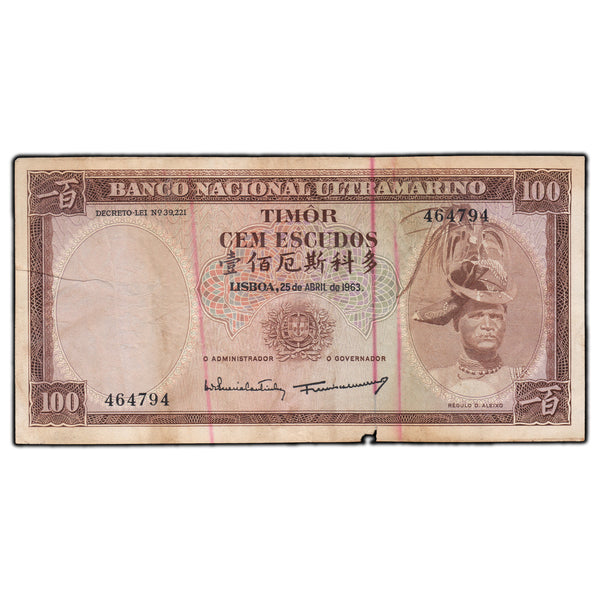 SOLD Portugal Timor 1963 100 Escudos P-28 - Piece Missing