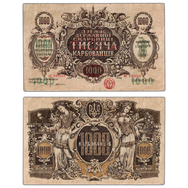 Available for sale is a Ukraine ND (1918) 1000 Karbovantsiv Note P #35a - Minor Tears Country: Ukraine Year: 1918 Denomination: 1000 Karbovantsiv Catalogue: Pick #35a Grade: Circulated Comments: Minor...